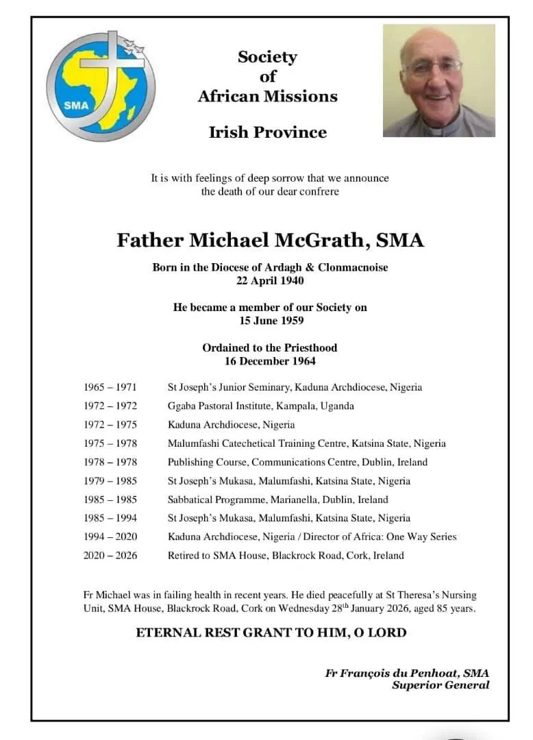 With profound sorrow but with total submission to the will God , we write to notify you of the death of Very Rev. Fr Michael McGrath, which sad event took place on the 29th of January 2026 at St Teresa Nursing home, blackrock road Ireland at age 85.